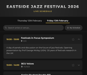 2014: Organiser, film and panel of jazz festival directors and researchers entitled Carnivalising the Creative Economy, AHRC Creative Economy Showcase, King’s Place, London.- 2013: Co-organiser, Thinking with Jazz symposium, Royal Festival Hall, London Jazz Festival.